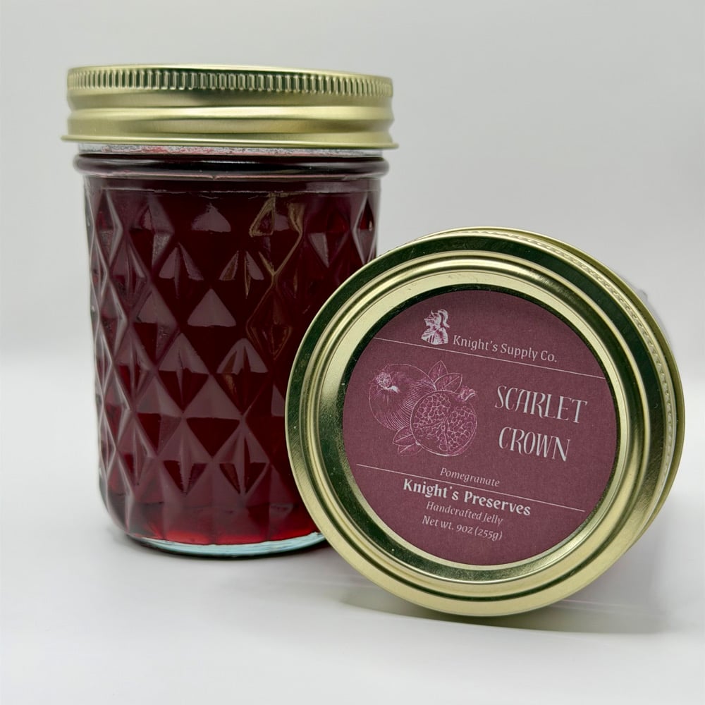 Crimson Crown is a small-batch pomegranate jelly made with simple, quality ingredients and poured with care. Bold in color, rich in flavor, and built to last.